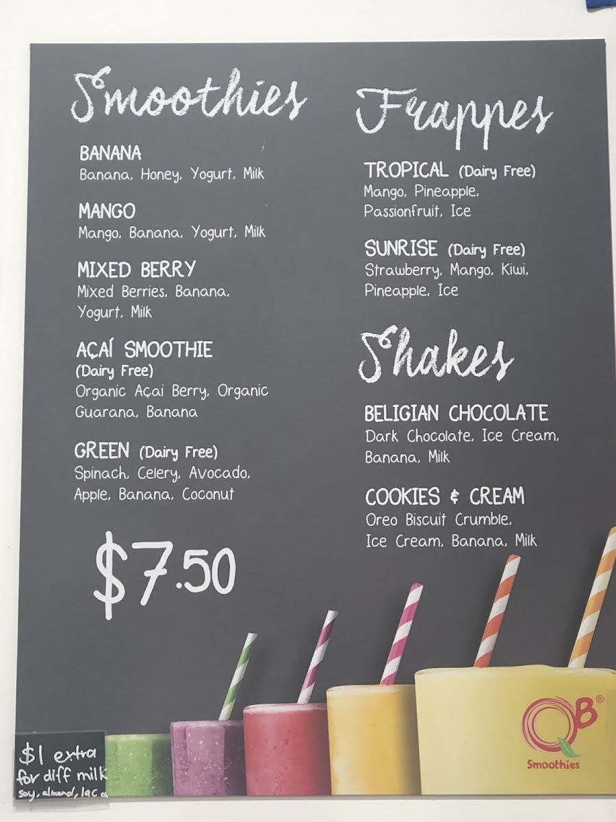 Banana, mango, mixed berry, açaí (dairy free), green (dairy free).